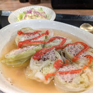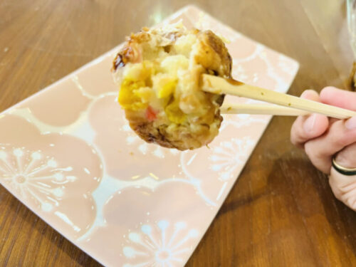 キャベツのシャキっとした食感とふんわりした生地のたこ焼きが同時に口の中いっぱいにひろがって、たくあんなどの具材が絶妙なバランスで合体。うわぁ、なんだろう。このシャキふわの新食感!
