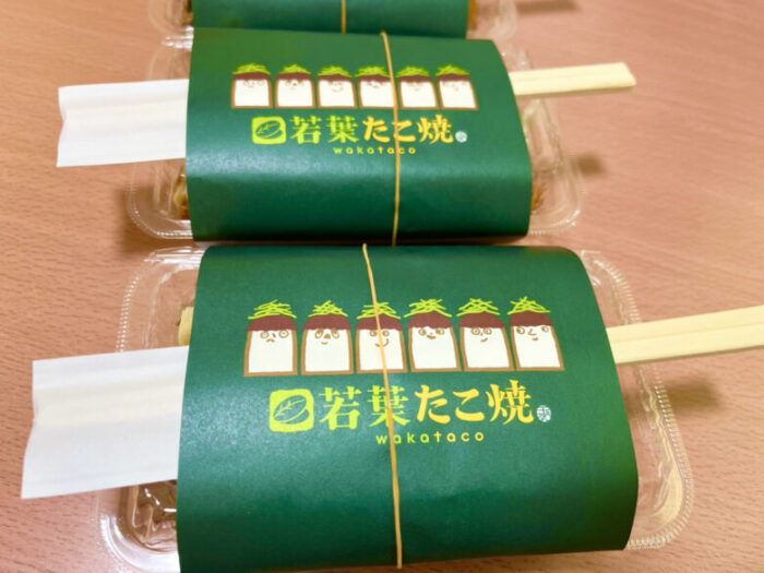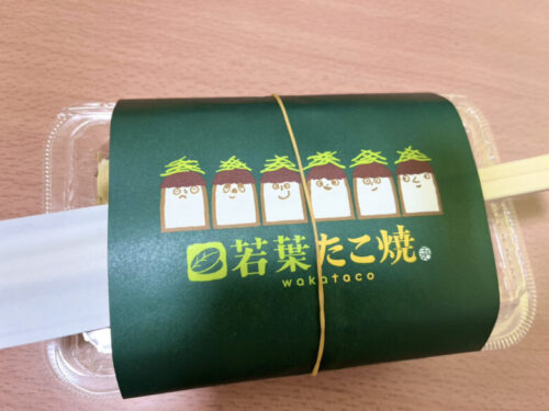 さっそく「若葉たこ焼」をテイクアウトしました。まずは、四角形の顔つきイメージキャラクターに目が釘付けに。