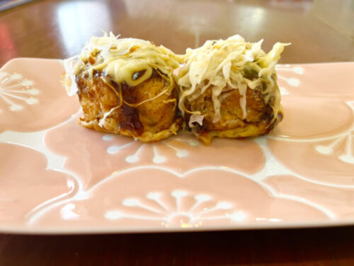 大玉のたこ焼きの上に、シャキシャキきゃべつがたっぷりと乗っています。