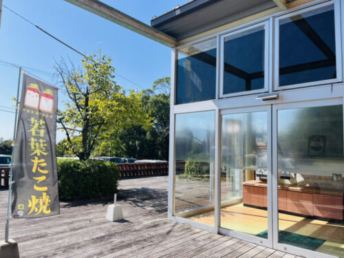 のぼりが立っているドアが「若葉たこ焼」の入り口。店の前には広めの駐車場があり、10台駐車OKです。