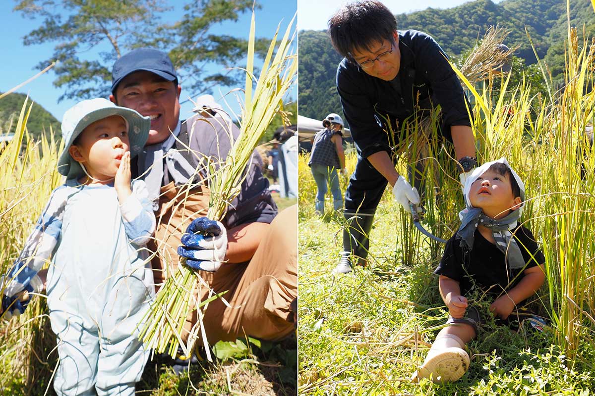 大船渡市の小学生中島龍司さん(8)は田植えにも参加していて、その時に作業した辺りの稲を刈り取った。「大きくなっていて、うれしかった。切る時に鎌を引いたりするのが難しかったけど、楽しい」とにっこり。母の愛海さん(30)は「お酒になるものだけど、コメの成長過程を知ることができた。普段食べているコメへの気持ちも違ってくる」とうなずいた。