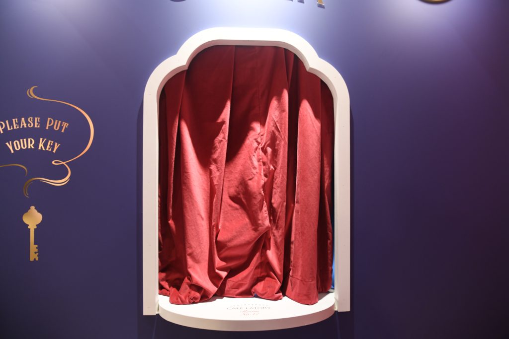 続いて「PLEASE PUT YOUR KEY」と書かれた壁の前に移り、その横のボックスに先ほどもらった鍵型のチケットを置いてみると、カーテンが閉まって待つことしばらく……。