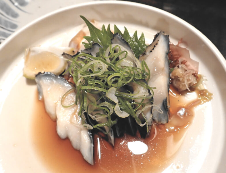ウツボを強火で皮ごとあぶり、骨抜きして作るウツボのタタキ。香ばしさと弾力のあるゼラチン質の食感がとてもマッチし、甘みもあってなかなか美味しかったです。