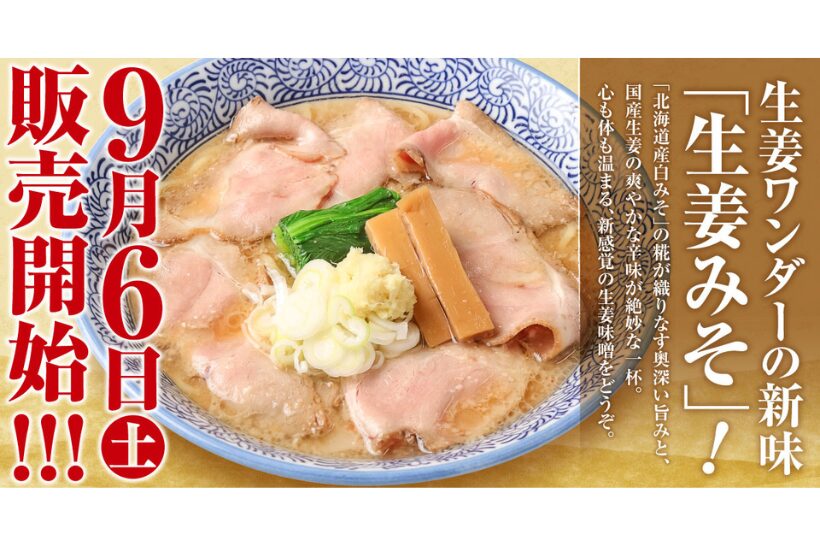 株式会社キタカタ(新潟市中央区)が運営する生姜らーめん専門店「生姜ワンダー。」(仙台市青葉区)は、9月6日から新メニュー「生姜みそ らーめん」(税込み930円)の販売を開始した。
