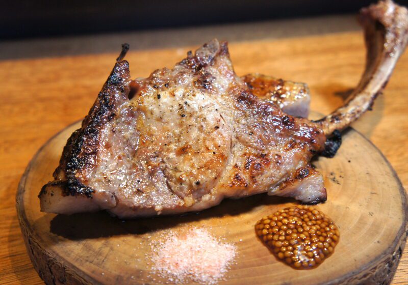 そしてこちらは「霧島産豚ローストマホーク」の炭焼です(1,980円)。300gの骨つき豚肉はインパクト大! 豪快にかぶりつく……わけではなく食べやすくカットしてくれます。松尾さんが惚れ込んだという豚肉は、産地から直送してもらっているそう。質感、旨み、甘み、どれをとっても上等です。
