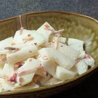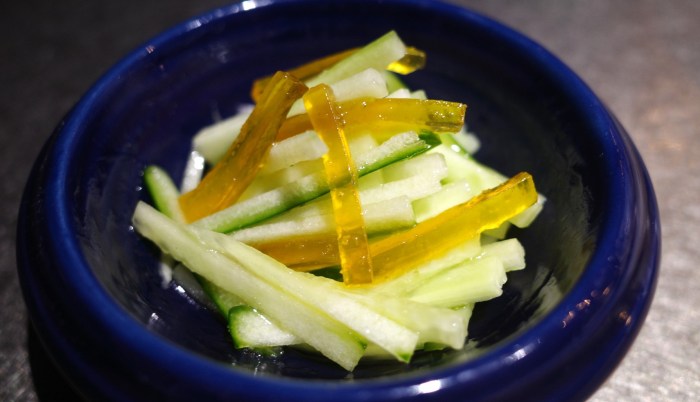 きゅうりの青臭さを、のし梅の甘味と酸味がうまく包み込んでくれて食べやすい。予想外にオリーブオイルとの相性が抜群で、舌触りをより滑らかにしてくれる。シャキっとしたきゅうりと、柔らかいのし梅との食感のバランスも良い。