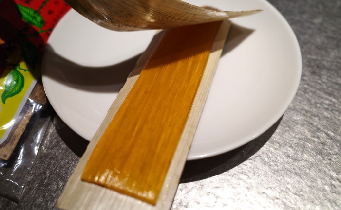 さっそく封を開けると、酸っぱい梅干しのような匂いと共に長方形の竹の葉が5束出てきた。竹の葉は一部テカテカしており、触るとベタっとしている。