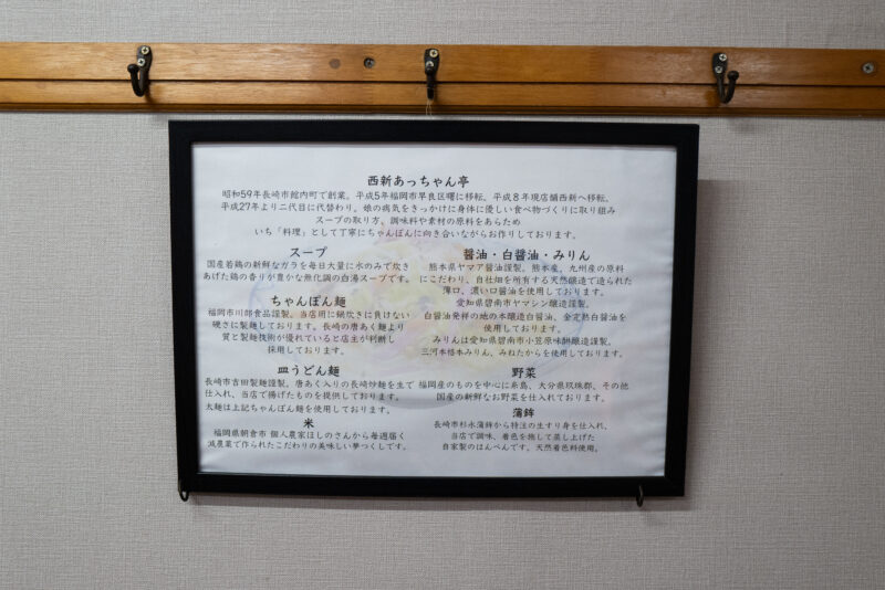 現在使っているちゃんぽんの原材料については店の随所に掲示してあるので、ぜひ来店時に見てみてほしい。スープをとる鶏ガラから醤油やみりんといった調味料まで、全てにおいて熟考してきたことがよくわかる。