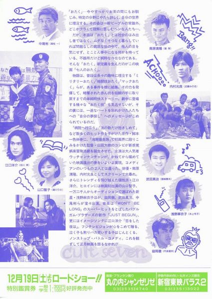 ▲山田大樹監督、一色伸幸原作・脚本の1992年公開『七人のおたく』。ミリタリーおたくの南原清隆、格闘技・ヒーローおたくの内村光良、Macおたくの江口洋介、レジャーおたくの山口智子、フィギュアおたくの益岡徹、アイドルおたくの武田真治、無線おたくの浅野麻衣子というメンバー。最終目的地となる「井加江島」のロケ地は伊豆大島。中尾彬は井加江島を支配している高松屋の主人を演じた。