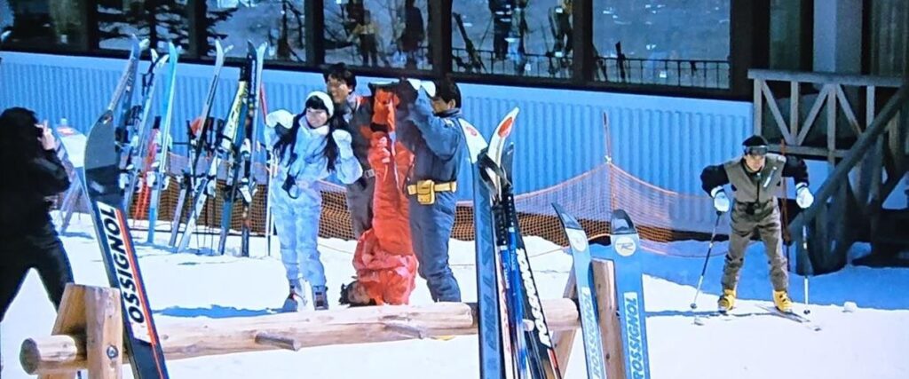 ▲馬場康夫監督、一色伸幸脚本の1987年公開『私をスキーに連れてって』。主演は原田知世、共演の三上博史はスキーができる俳優ということで抜擢され、本作を機にスター俳優へと駆け上がった。ヒロイン原田知世のニット帽にゴーグルスタイルは女性たちに大流行し、原田は日本アカデミー賞話題賞を受賞している。奥志賀高原スキー場、焼額山スキー場のゲレンデをはじめ、志賀高原プリンスホテル、万座プリンスホテルなどロケ地も話題になった映画。大晦日に三上博史たちが楽しむシーンは万座温泉ロッジ「ハウスユキ」で撮影された。当時、全日本スキー連盟会長だった堤義明氏から日本のスキー指導の第一人者で、万座スキー学校校長の黒岩達介氏への電話依頼で急遽撮影が決まり、通常営業をする中、3日間徹夜で撮影が実施されたという。スキーを八の字にした前走者の足の間に、同じように八の字にした後走者がスキーを入れて列車の一両編成のように連なった状態で滑る「トレイン走行」は、焼額山スキー場でのシーンであった影響から、焼額山スキー場でトレイン走行をするスキーヤーたちが増えた。写真は焼額山プリンスホテルの前での原田知世ら。