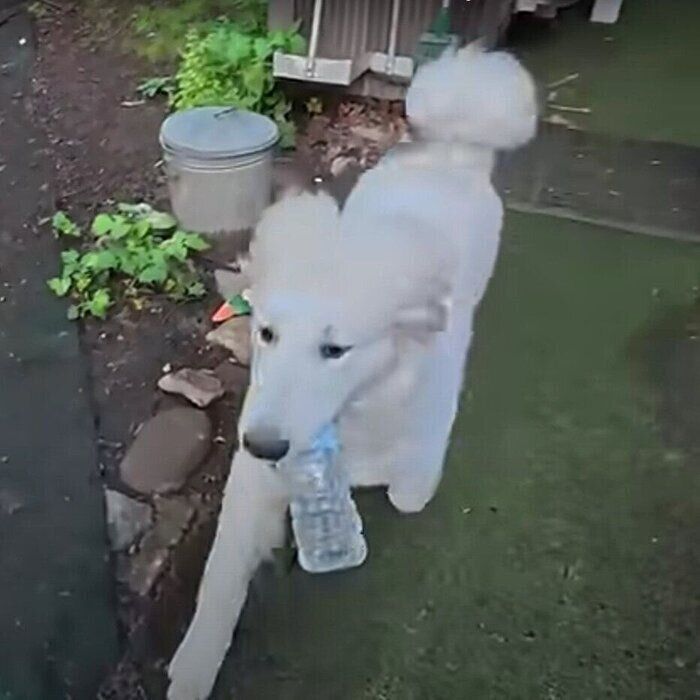 お庭で散歩の準備! ペットボトルを持って走り回るグレート・ピレニーズがかわいすぎた
