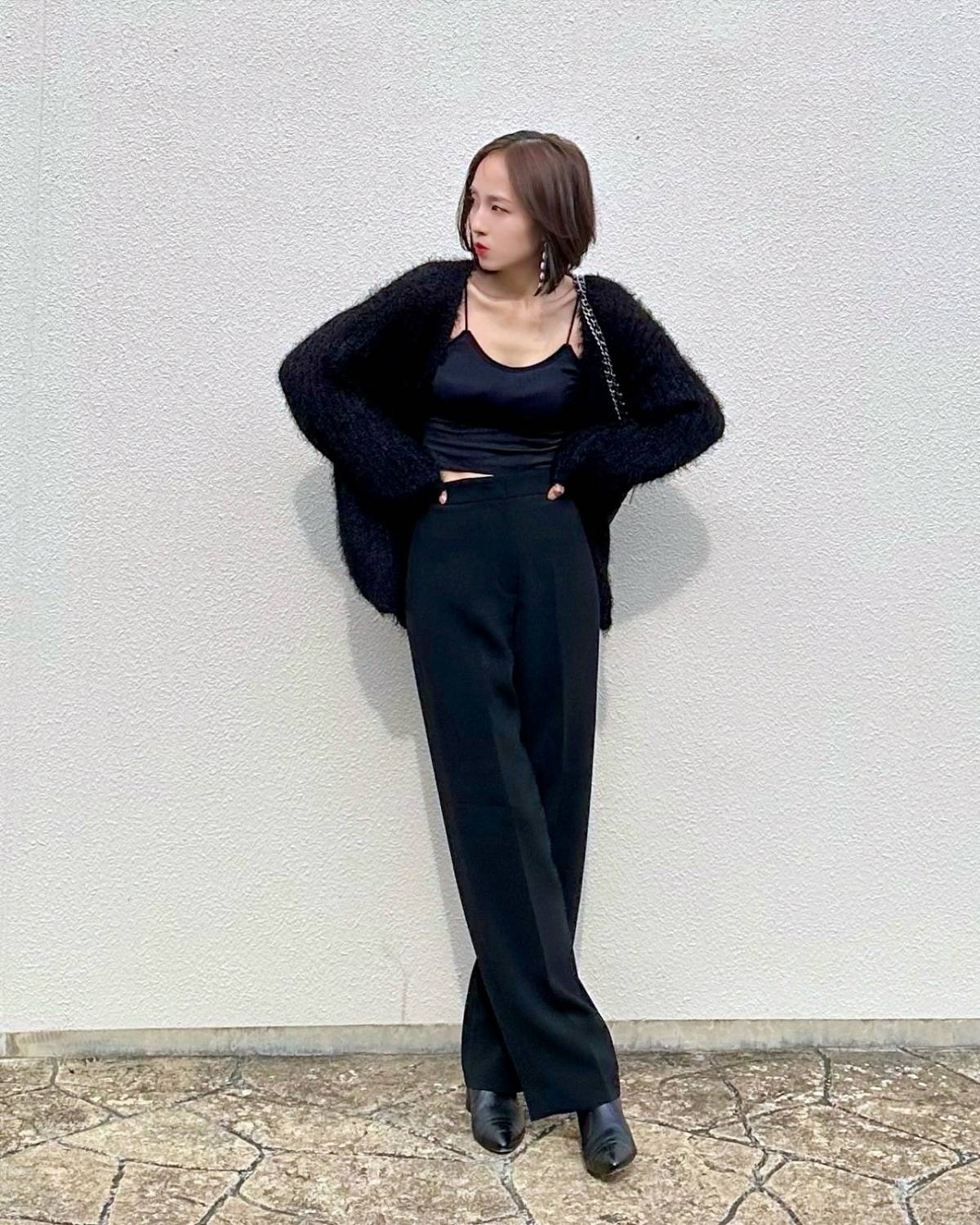 黒トップスと黒パンツの上に黒カーディガンを羽織るときはインナーにキャミソールを選ぶとセンスがよく、デコルテを見せることで重たさを軽減できます。
