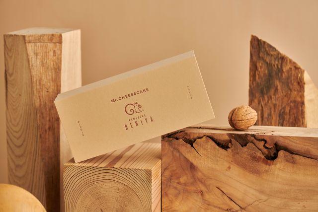 レトロな見た目がかわいらしい鎌倉紅谷のシンボルキャラクター“リスくん“をあしらった、優しくやわらかい色合いの限定ボックスと、クルミッ子を彷彿とさせる色合いのサテンにチーズケーキを包んでいます。