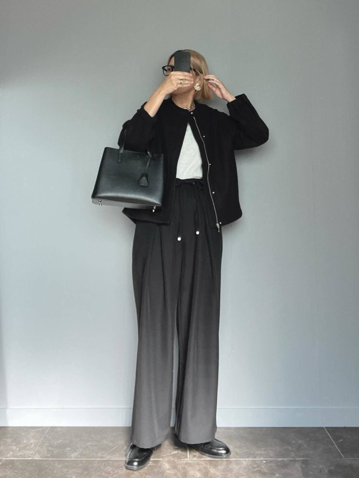 黒ブルゾン×黒パンツのブラックコーデは大人っぽく、50代の女性にピッタリ♡