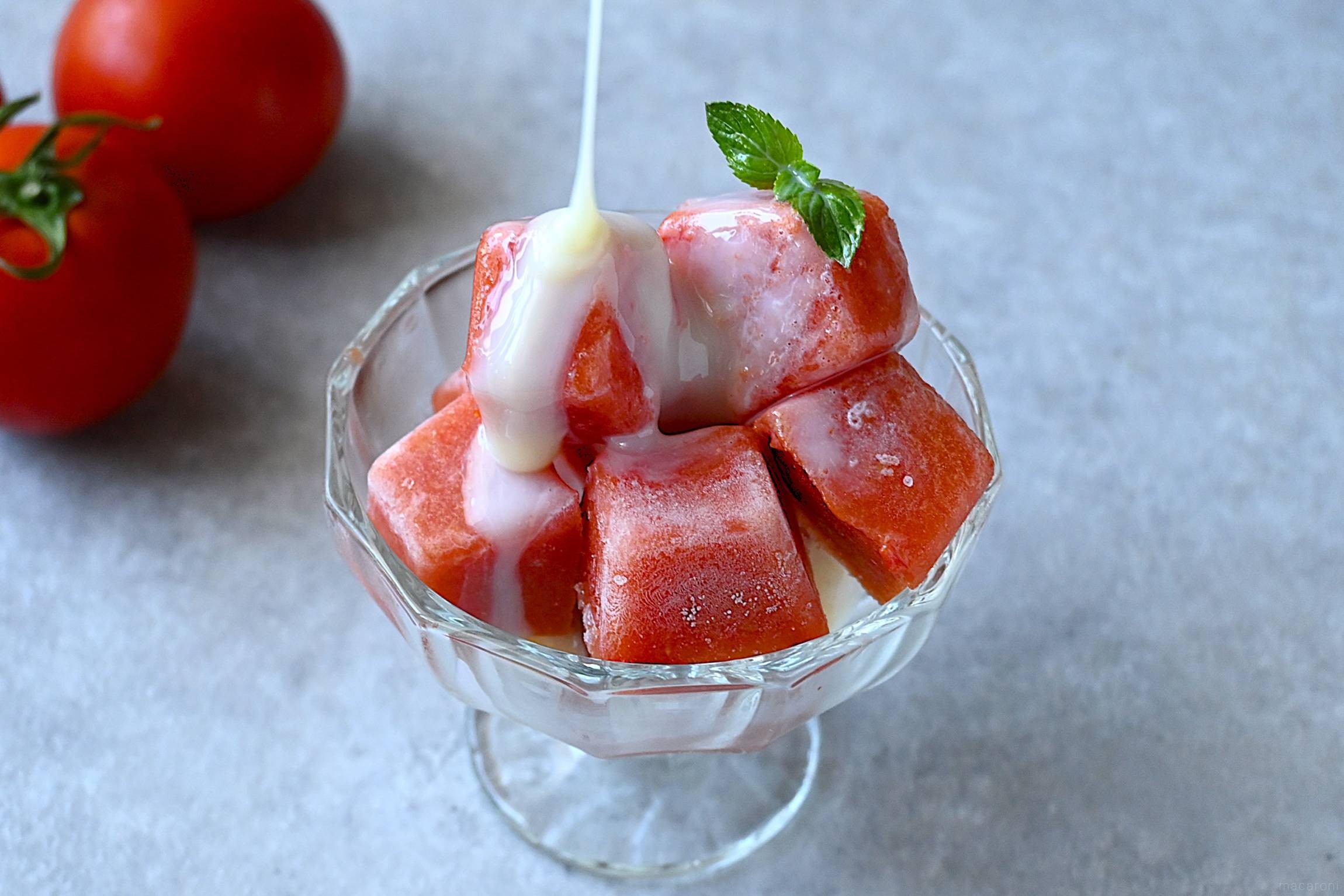 トマト氷に練乳をかけてそのまま食べるのもおすすめ。子供も喜びそうなひんやりさっぱりとしたデザートに仕上がりますよ。
