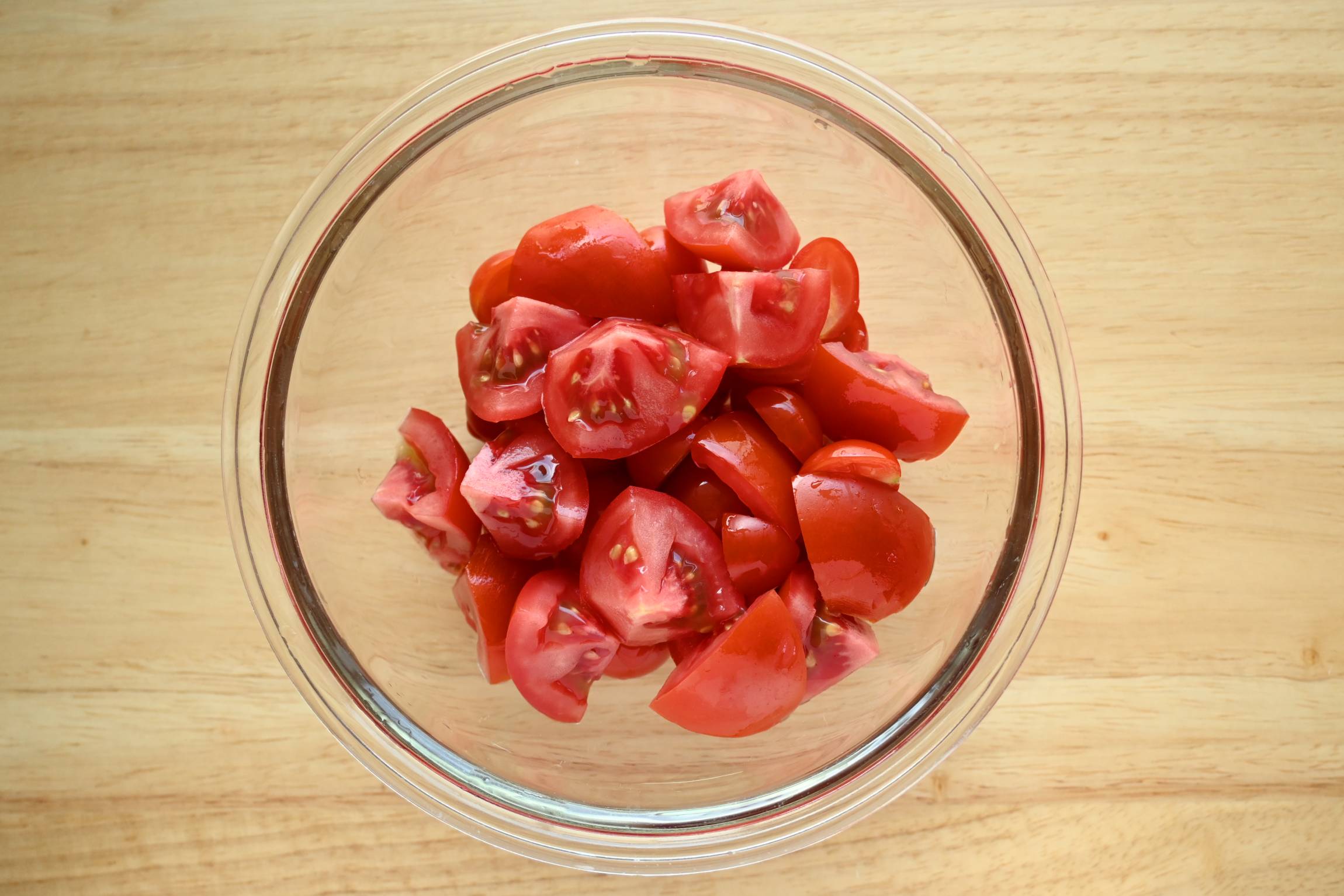 トマトはヘタを取ってざく切りにし、耐熱容器に入れます。