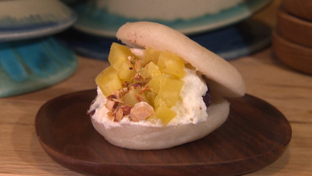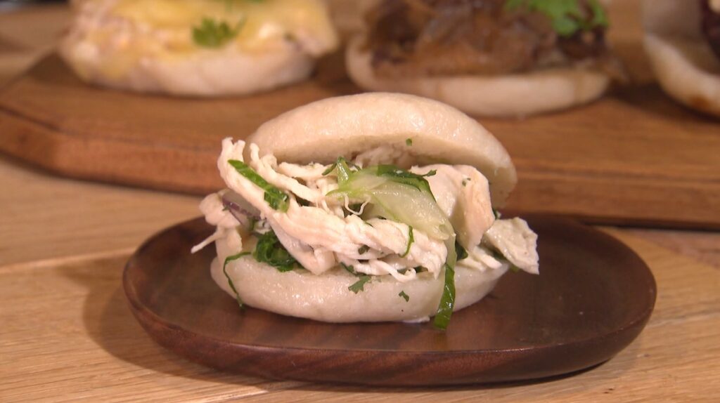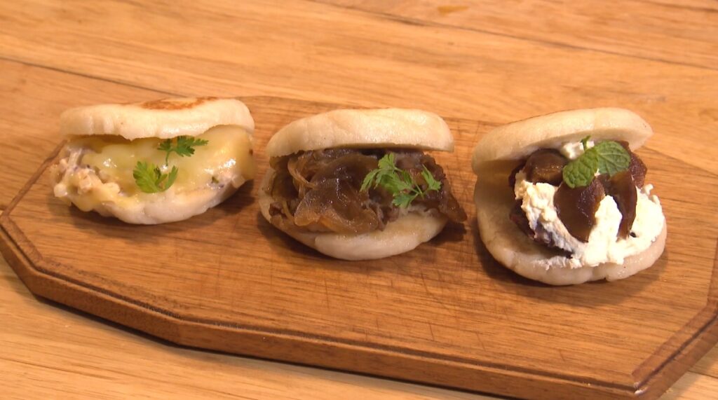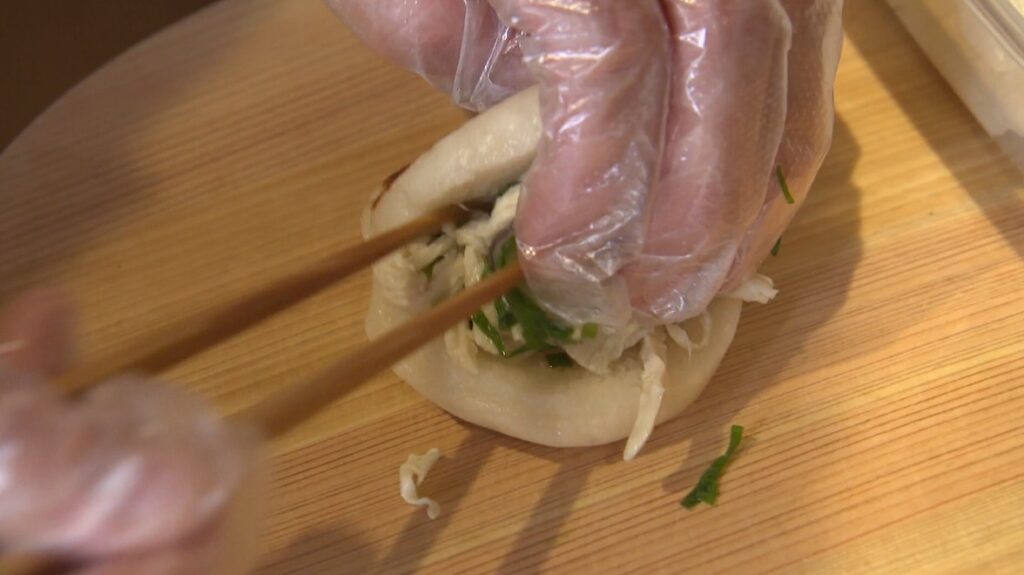 従来のスタイルにこだわらない点は他にも。まず生地は米粉で仕立てたもっちりタイプ。具の種類も、伝統を知らないからこそ自由自在。こちらは「セロリと蒸し鶏」のおやき。