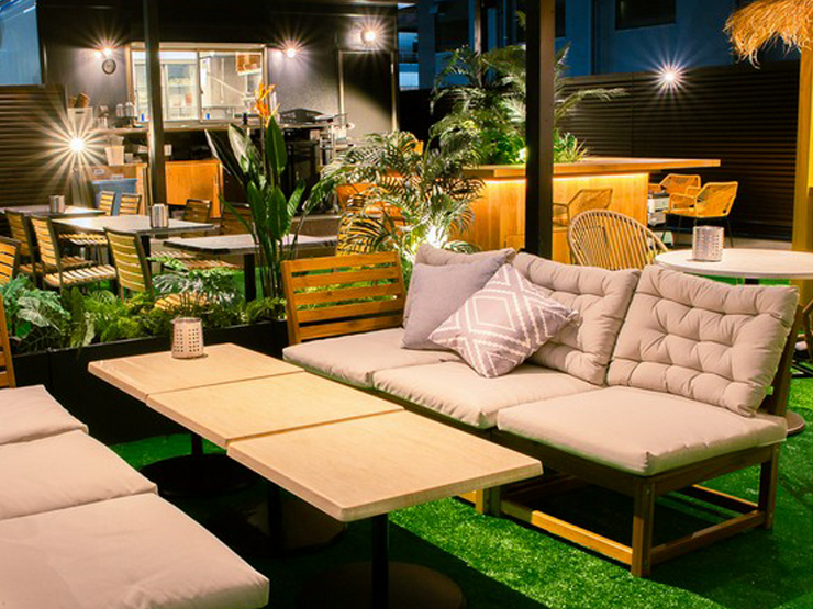 一歩足を踏み入れると、そこは非日常を楽しむリゾート空間。ビルの明かりとイルミネーションが眼下に広がり、パーティー気分をさらに盛り上げてくれます。ソファー席やカウンター席もあり、思い思いに楽しめる雰囲気。都会のど真ん中とは思えない、心からリフレッシュできるスポットです。