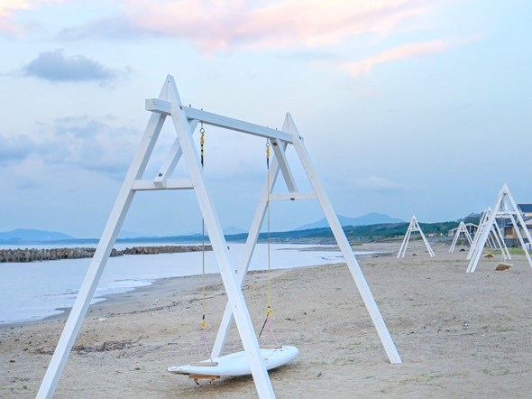 2025年8月、福岡県・岡垣町の波津海岸に10基のブランコが登場しました!ビーチに映える真っ白なブランコは、全てサーフボートをリメイクしたもの。波打ち際ギリギリにあったり、砂浜スレスレだったりと、10基とも個性豊かなんです!