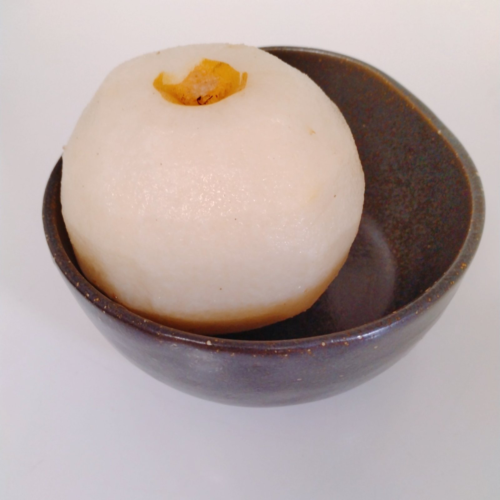 皮が半分ほど剥けたら梨の上下をひっくり返して、同じように残りを剥いてください。