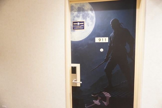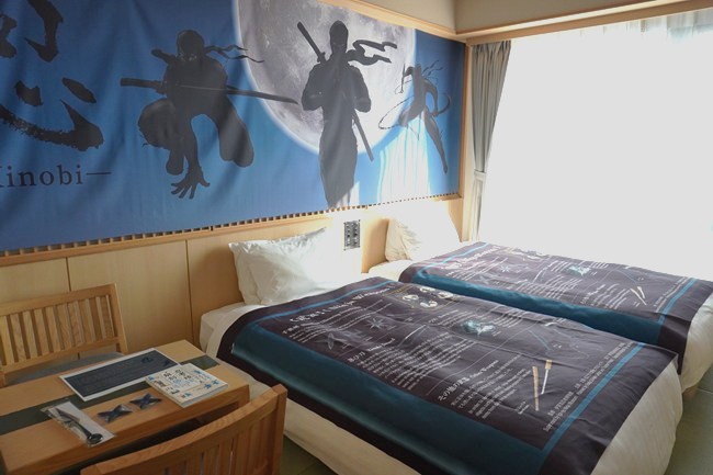 10階建てのホテルの9階に1室のみある『忍者ルーム』は、内も外も忍者だらけ。全面に施された忍者デザインや突き刺さった手裏剣を一目見た瞬間、テンションが上がります。