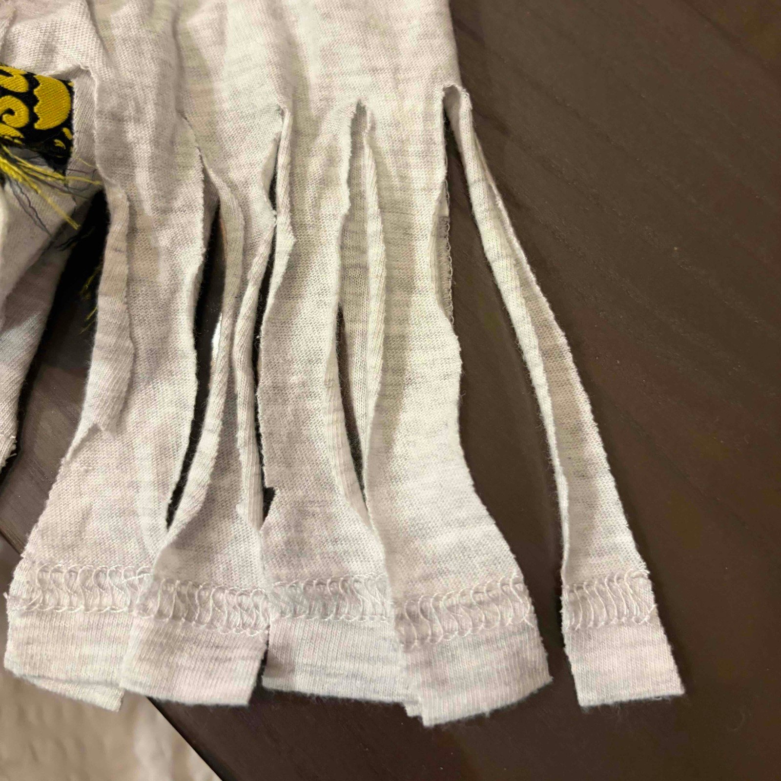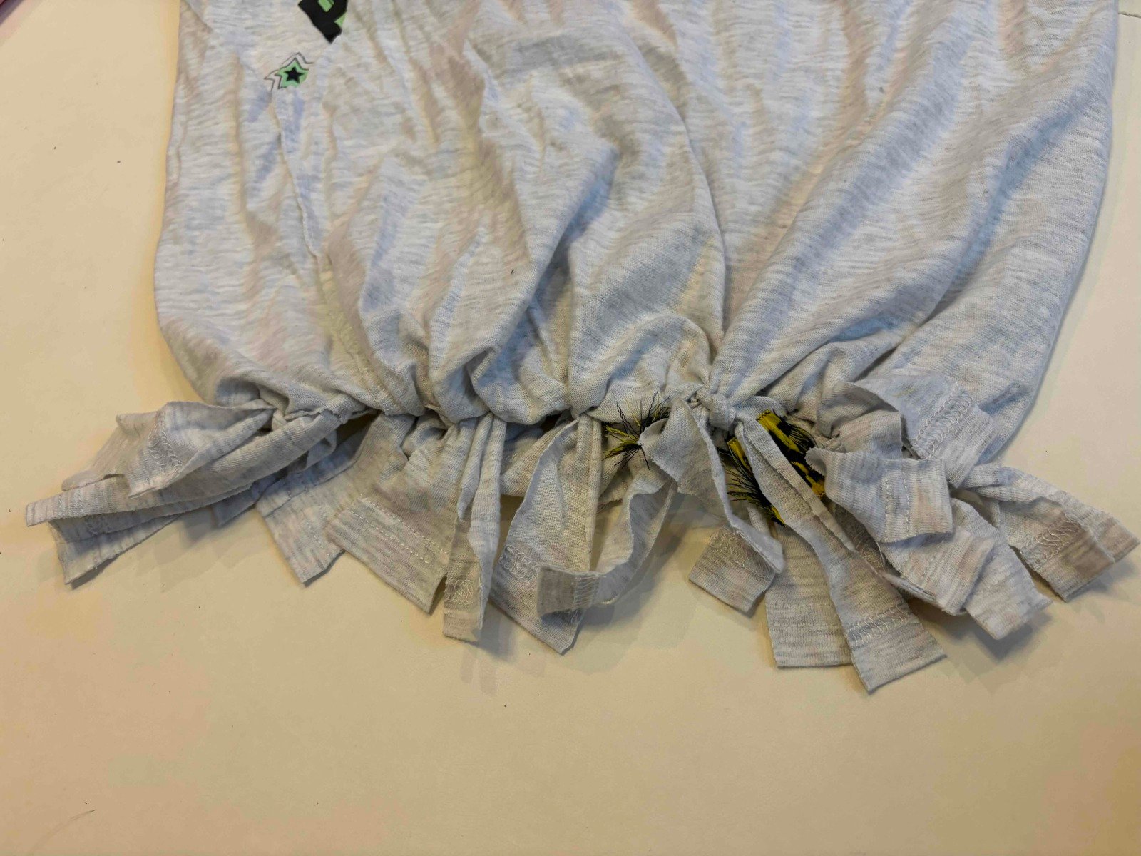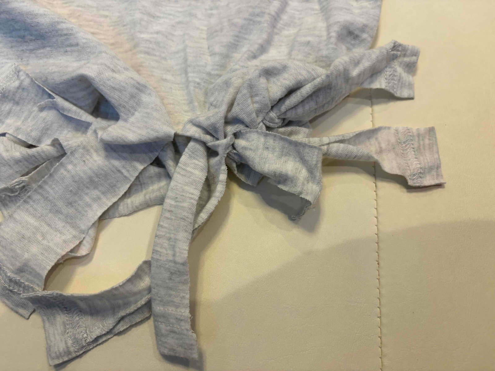 【3】Tシャツの裏表をひっくり返し、切った部分をかた結びしていく