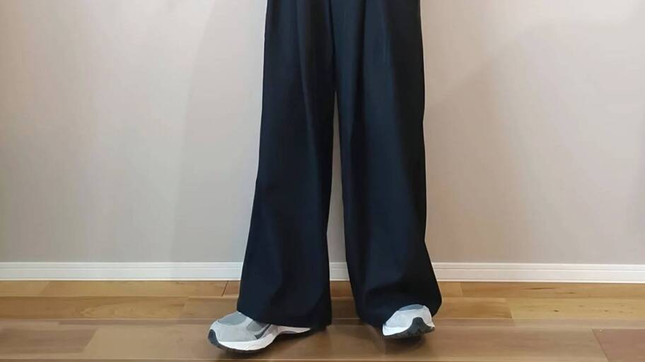 脚のラインが目立たない、ワイドシルエットの黒パンツ。