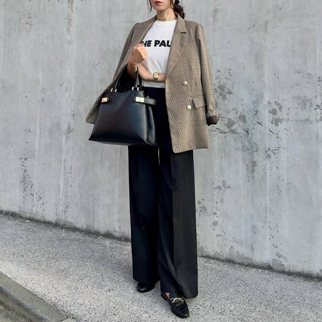 チェック柄のジャケットを肩掛けして、レザー素材のバッグや靴を合わせると◎