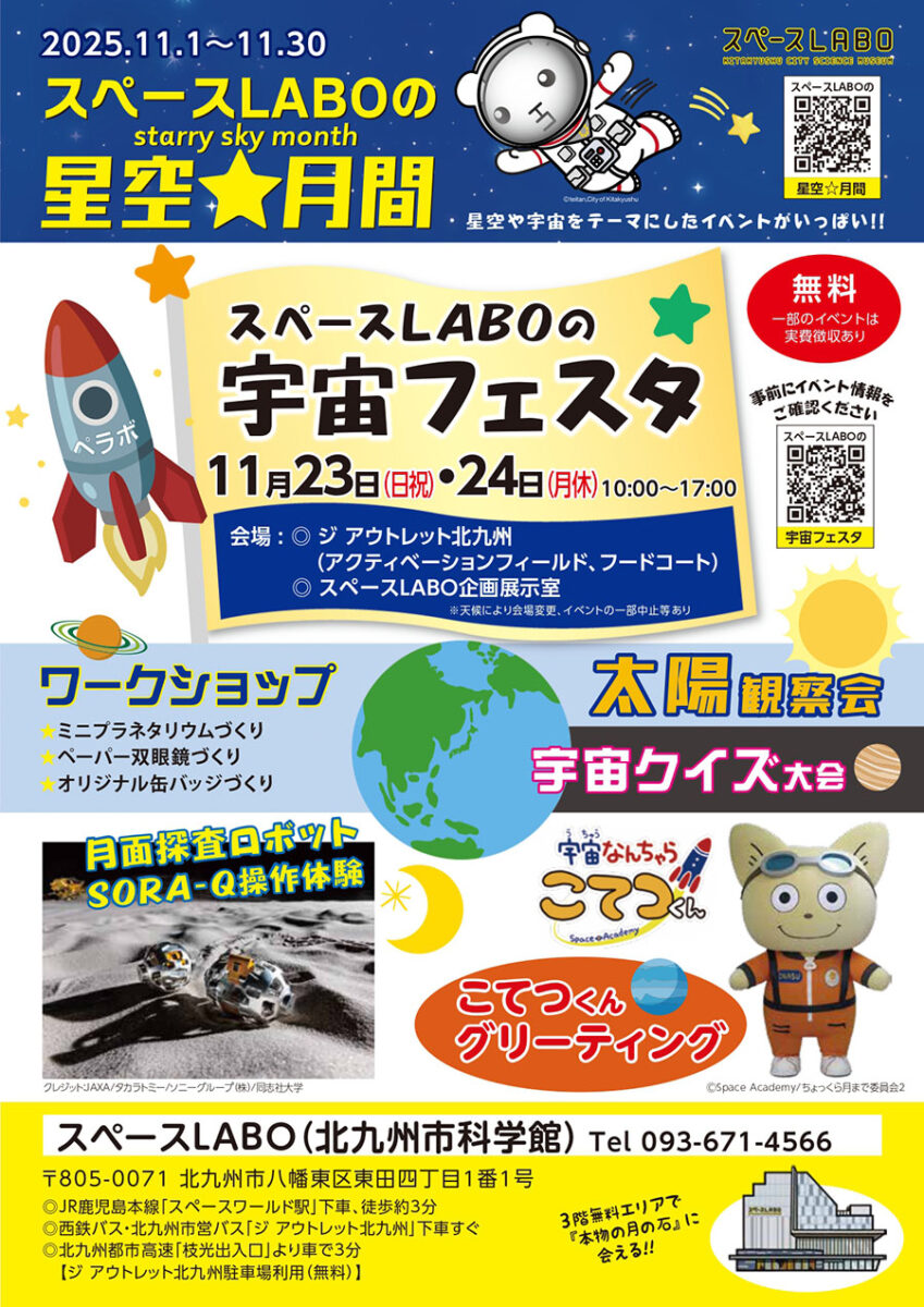 北九州市八幡東区のスペースLABO(八幡東区東田)では、星空の美しい11月を「スペースLABOの星空☆月間」として、太陽観察会や月面探査ロボット「SORA-Q(ソラキュー)」の操作体験、JAXA宇宙科学研究所の研究者による講演会など、宇宙をテーマにした多彩なイベントを行います。