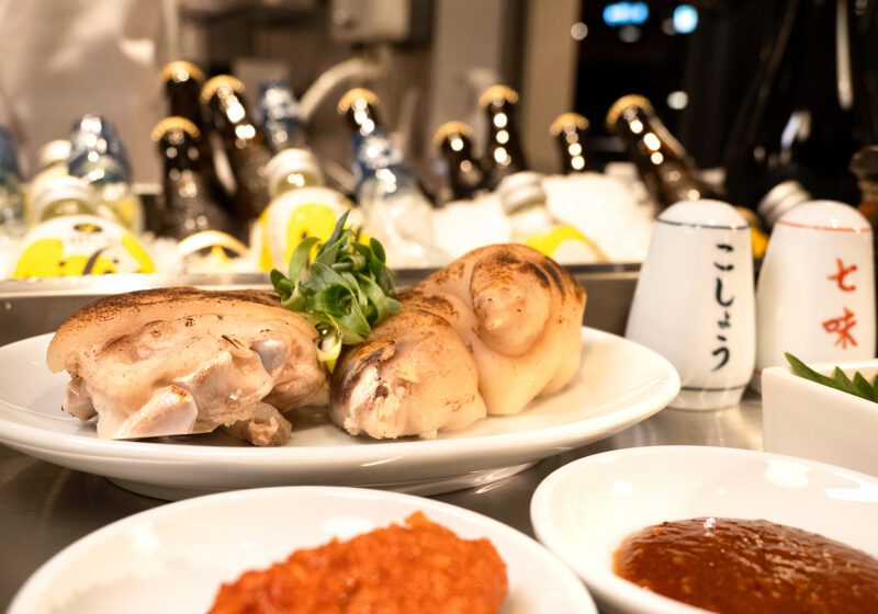 丁寧に下処理された「てっぽう(直腸)」「ぴーとろ(首肉)」(各1本300円)などのもつ焼きはもちろん、大釜で炊く「名物 豚足」や「コブクロポン酢」(各500円)もいい! シメの一品「マルタイふる矢の棒ラーメン」も気になりすぎます〜。