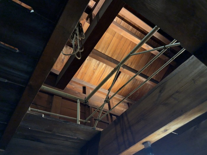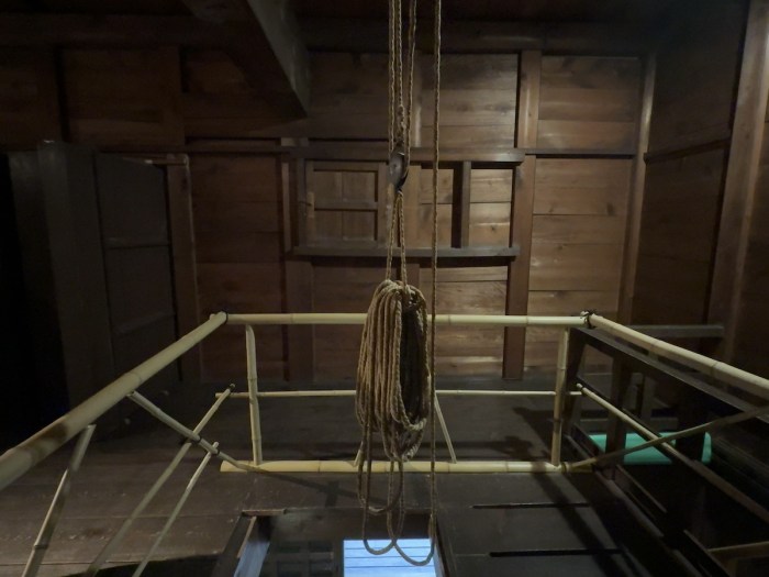 二階に足を進めると、梁から吊された荒縄の様子がよくわかる。