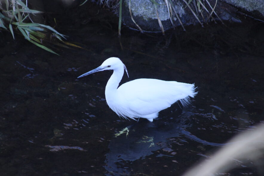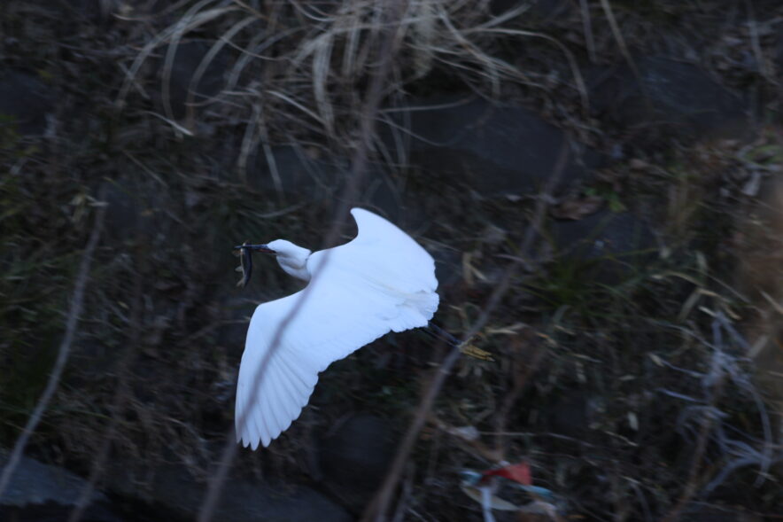 これも筆者目線の感想ですが、コサギはダイサギよりもさらに警戒心が薄いと感じました。筆者が真横を歩いていてもお構いなしに魚を捕らえて悠々と運んで行きました。