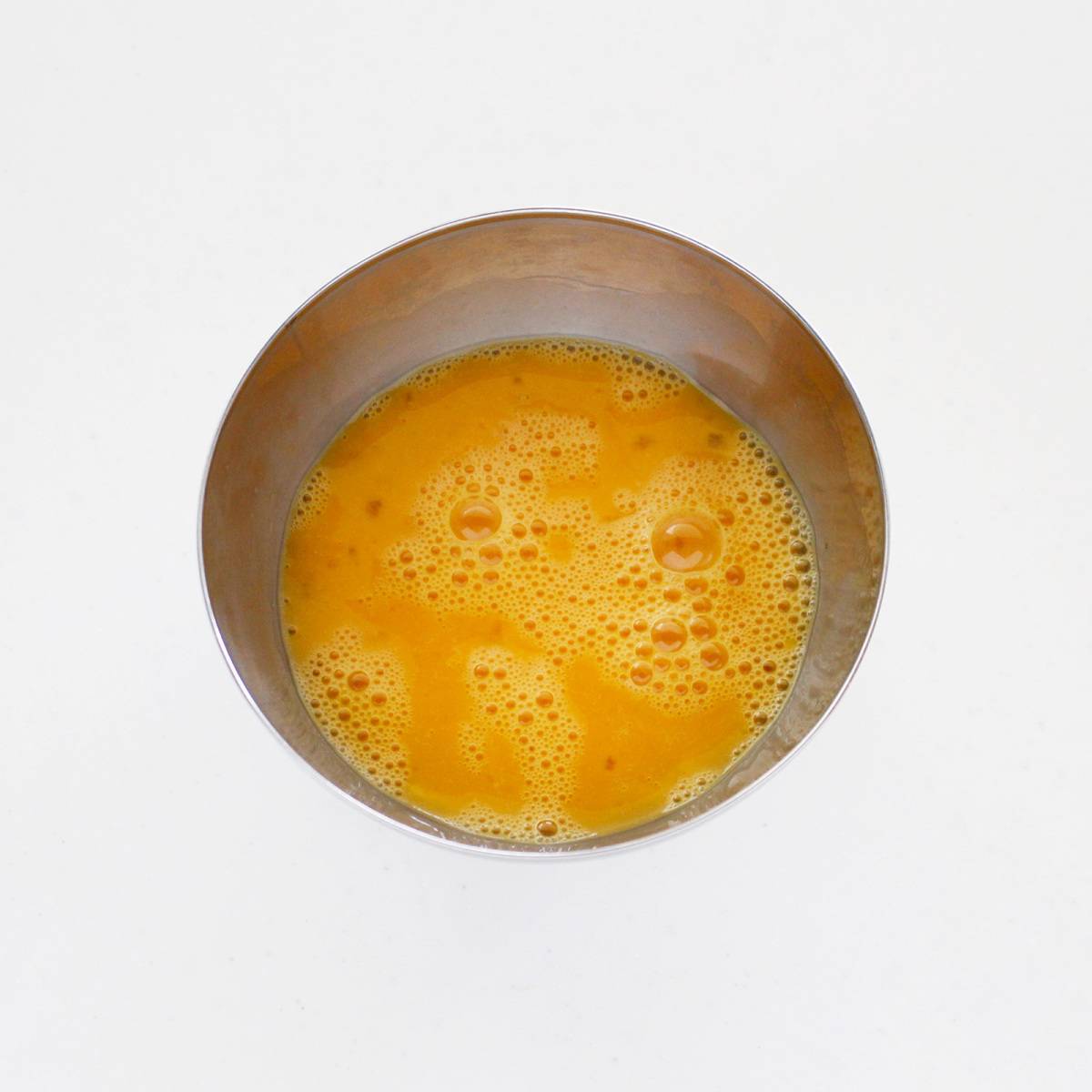 ときほぐした卵にめんつゆを加え、よく混ぜましょう。