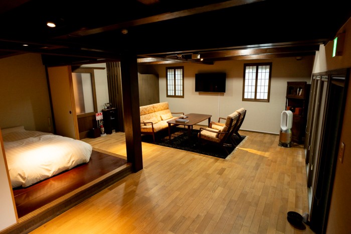 「竹林月夜」は、蔵をリノベーションした2階建ての離れタイプ。これが1階部分で、リビングとベッドルームみたいなエリア。
