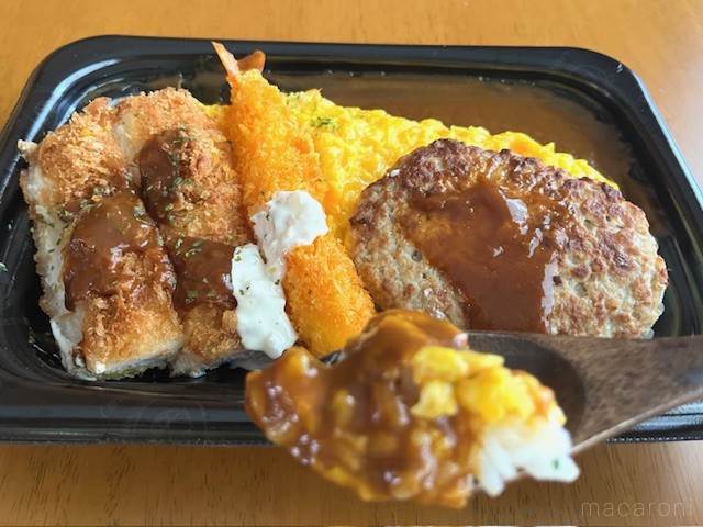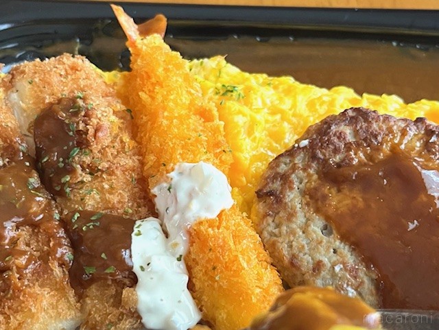ロピアの「大人のお子様ランチ」のおかずは、昔ながらのつわものぞろいです。ハンバーグ・エビフライ・チキンカツ・カレー・半熟卵の全5種類。ワクワク感あふれるラインアップです。おかずに負けず、ごはんも大盛り。おかずとのバランスも絶妙です。