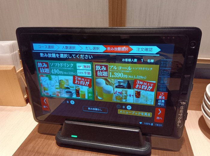 どうせ3000円以上のしゃぶしゃぶ食べ放題なら牛も食べたい。そこで「冬のゆず庵コース(税込4048円)」を選択。オプションでドリンクバー(税込539円)をつけてみた。