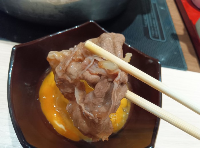 そうと分かれば、まずは熟成牛祭りだ。そのためにだしの1つはすき焼きで注文しているのだから。ちなみに、生卵は1人1個無料で、追加から1個税込55円である。しゃぶ葉が1個目から55円かかることを考えると、微妙にホスピタリティーを感じる。
