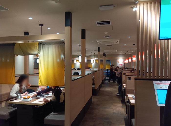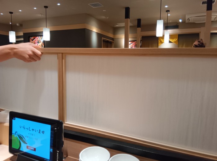 席につくとスタッフさんが敷居を引き上げてくれ、それが目隠しになって隣席とかも気にならない半個室的な雰囲気に。最初座った時点ではオープンだっただけに、これがあるのとないのとでは全然違うことが分かる。