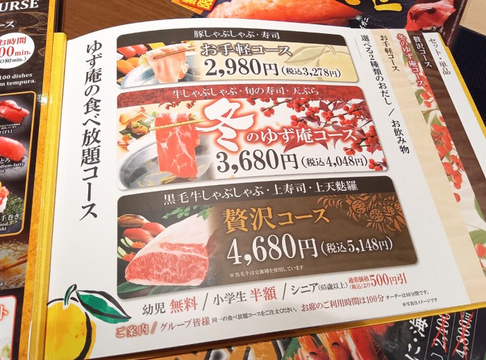 メニューの食べ放題コースを見てみると最安は豚しゃぶしゃぶ・寿司食べ放題の「お手軽コース(税込3278円)」。なお、店のオススメは真ん中の価格の「冬のゆず庵コース(税込4048円)」であるようだ。