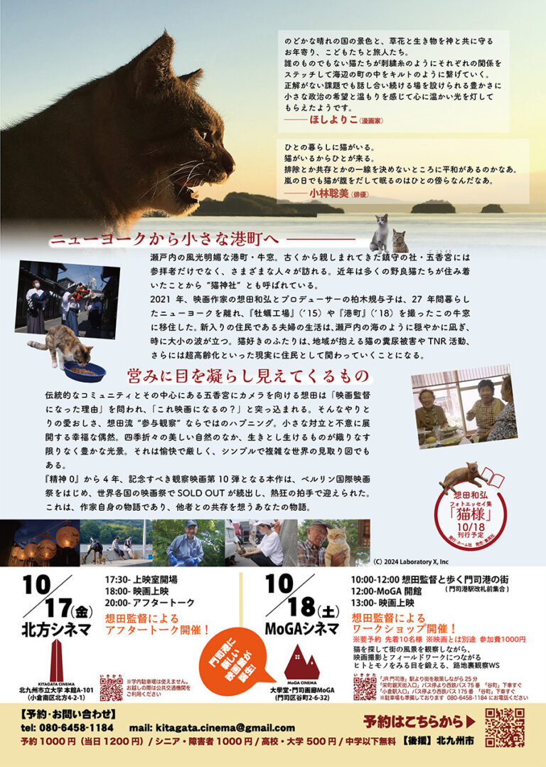 北九州市立大学につくられた北方シネマは、地域に開かれた映画館として毎月ドキュメンタリー映画を上映してきました。10月は、猫好きの方にはぜひご覧いただきたい、猫と人の暮らしを描いた映画を上映予定です。『選挙』や『精神』を手がけた想田和弘監督の最新作で、北九州初上映となります。