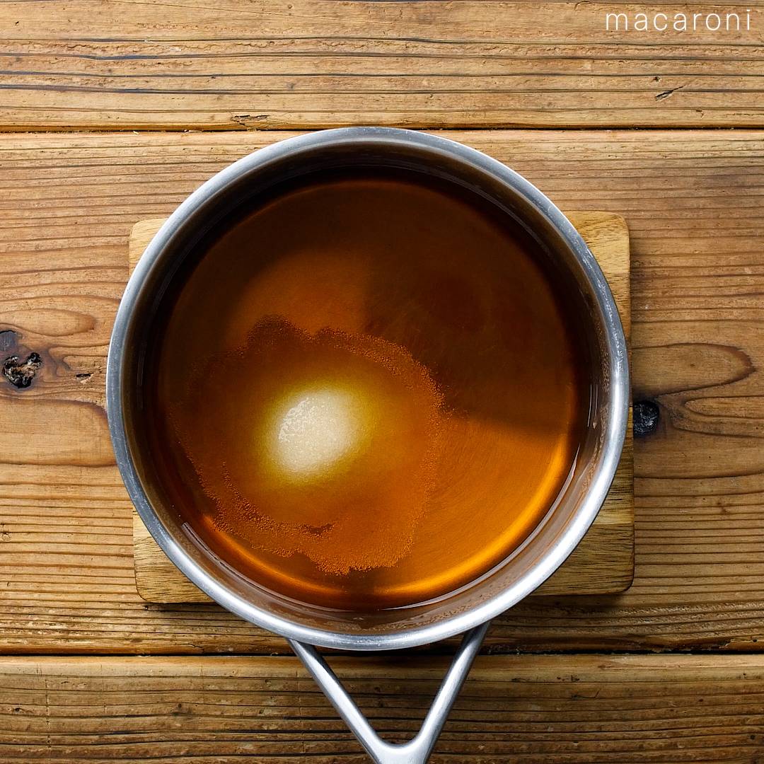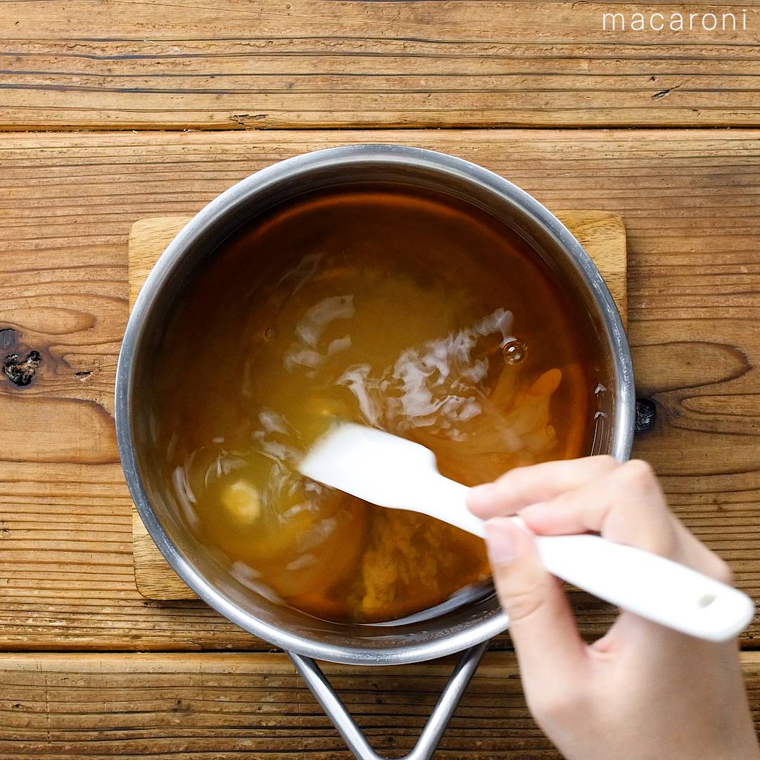 3: 50~60℃まで冷ましてゼラチンを加え、溶けるまで混ぜ合わせます。
