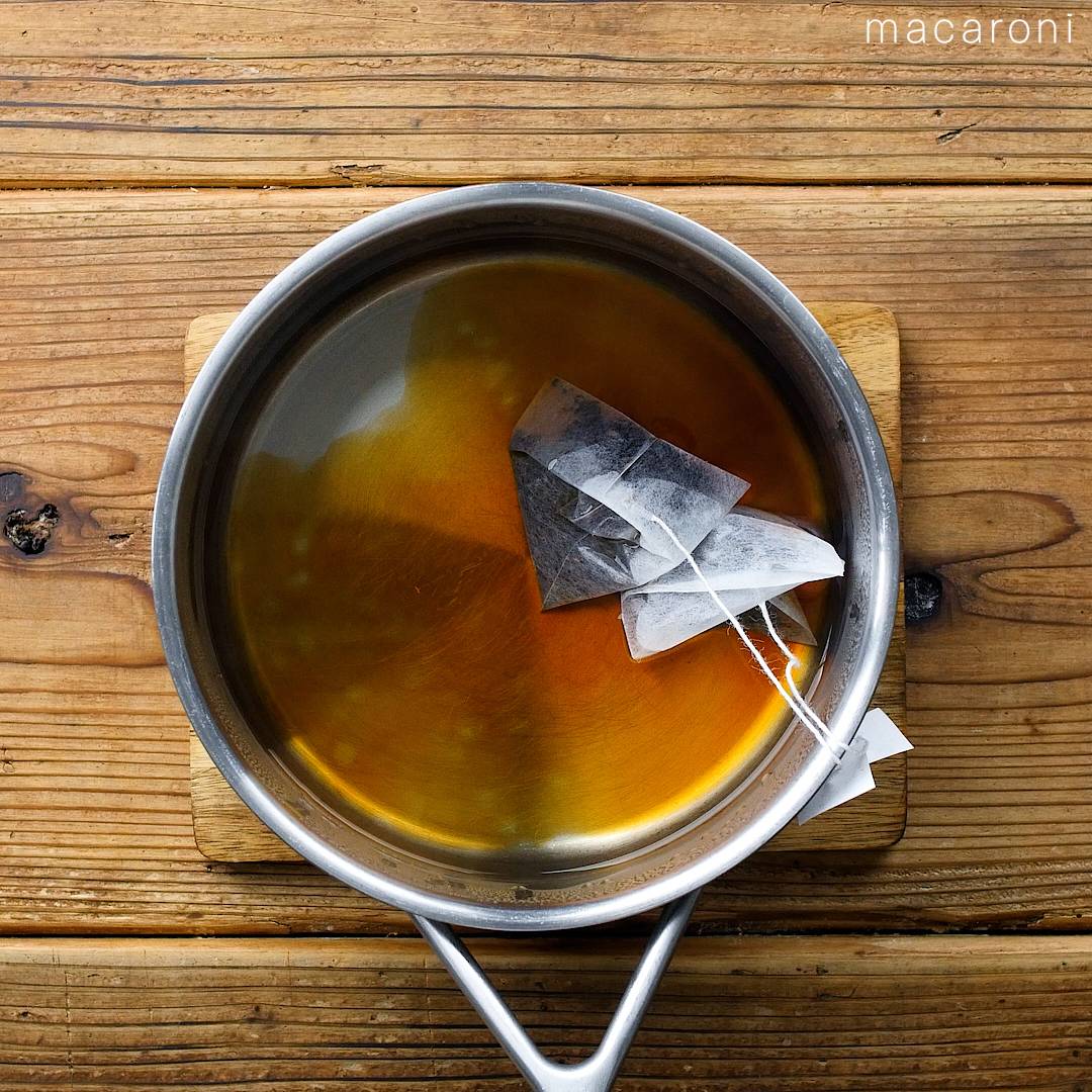 1: 鍋に熱湯を沸かして火を止め、ティーバッグをいれたらフタをして1分30秒蒸らします。