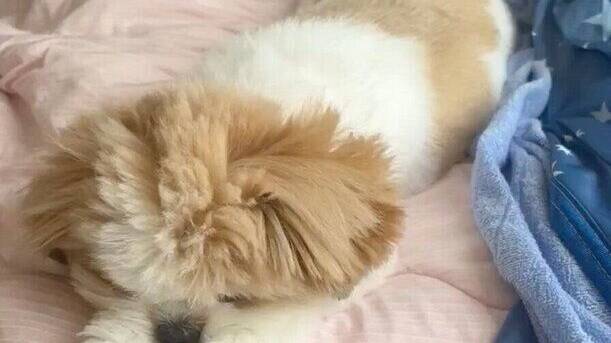 この日、うるくんは飼い主さんのおなかの上でスヤスヤとお昼寝中。おなかと毛布の間にはさまり、なんとも幸せそうな寝顔を見せていたそうです。しかし、飼い主さんが呼吸するたび、うるくんの体もふわりと横揺れ。その姿はまるで、春先の野原で風にそよぐ『つくし』のようだったといいます。