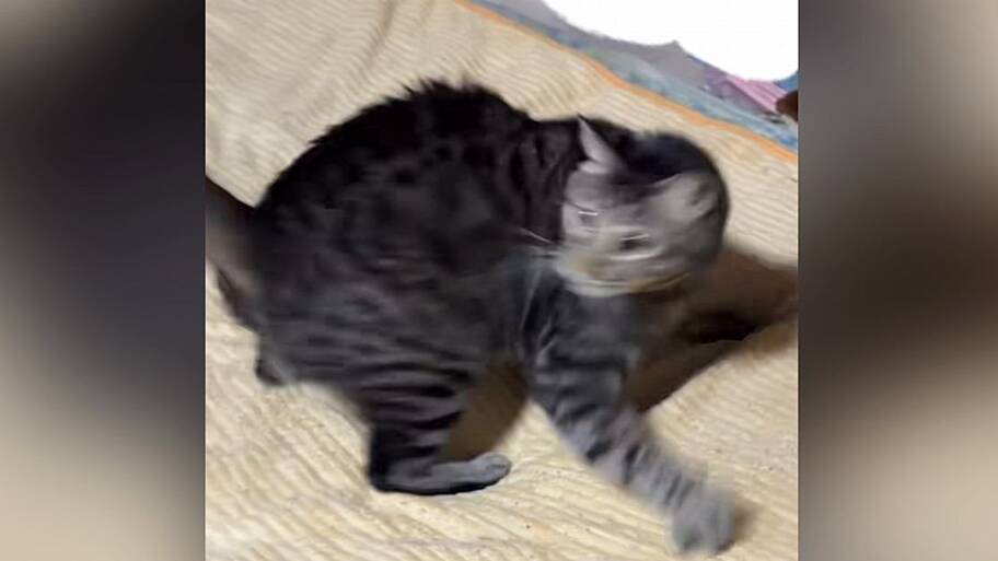 自分のおなかの上で『つくし』そっくりの猫が揺れている……その光景に思わず笑ってしまったという飼い主さん。すると笑うたびにおなかが動き、うるくんの揺れはさらに加速!