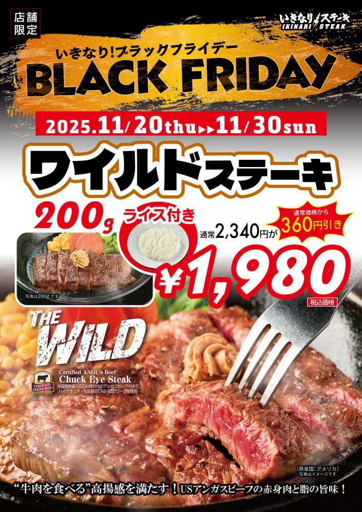 ペッパーフードサービスが運営する「いきなり!ステーキ」では、2025年11月20日から30日まで、店舗限定で「ブラックフライデー」キャンペーンを開催しています。