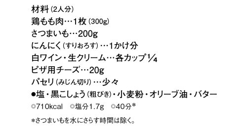 1 さつまいもはよく洗って皮ごと3cmくらいの乱切りにし、水に5分間さらして水けをきる。鶏肉は7~8等分に切り、塩小さじ1/3、黒こしょう少々をふり、小麦粉大さじ1をまぶす。