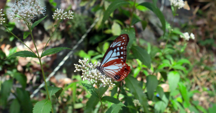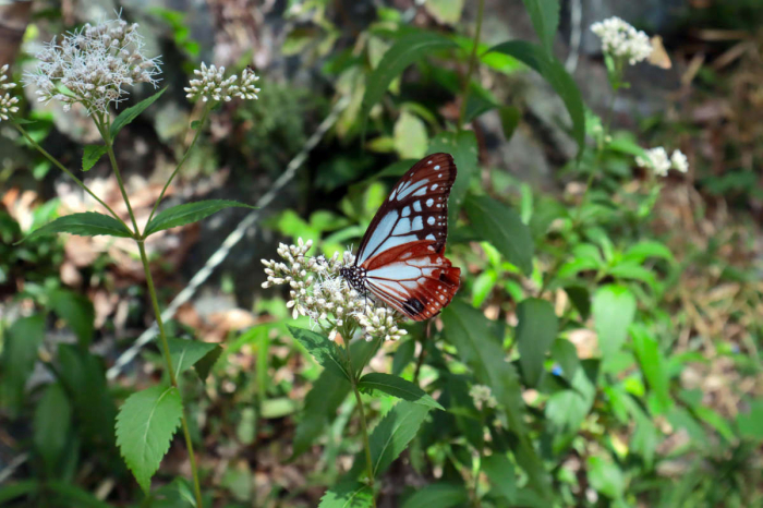 最初のカーブを曲がったところで、思わぬ出会いが。長距離を移動することで知られる蝶「アサギマダラ」です!空色と茶色の模様が鮮やかで、なんとも美しい~!