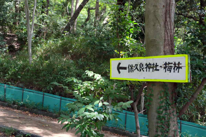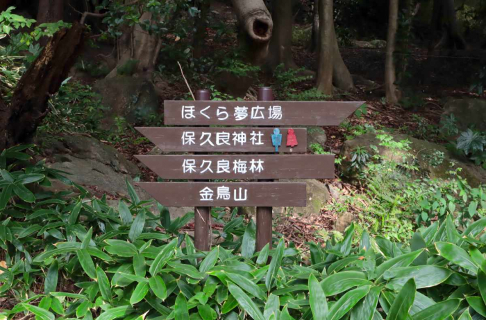 入ってすぐの場所には「保久良神社・梅林」と書かれた看板があるので、それに従って進んでいきます。