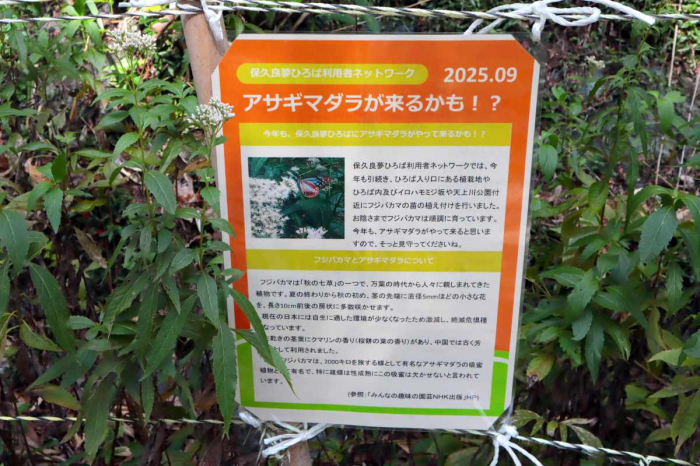 こちらの地区では、アサギマダラが好む「フジバカマ」の植え付けを行っており、今の時期はこうして飛来してきたアサギマダラを観察することができるのだとか。