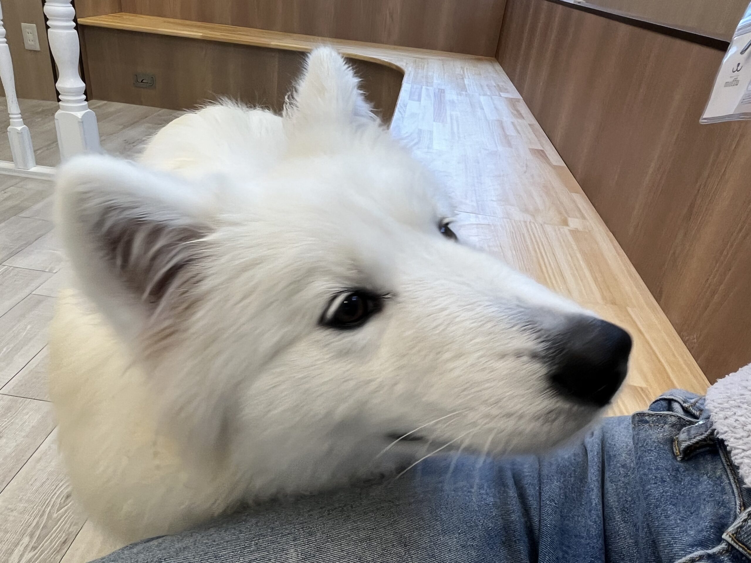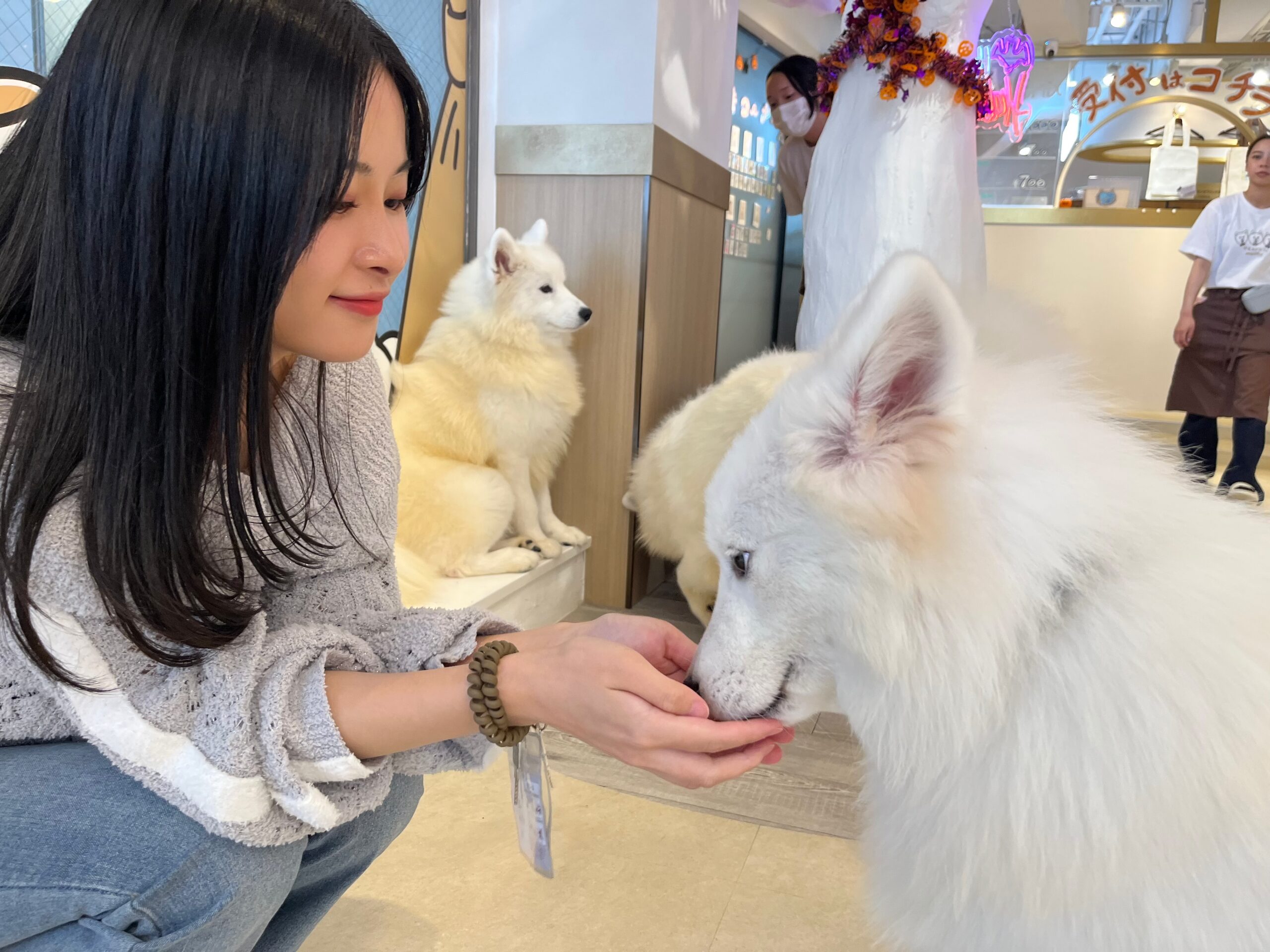 とっても人懐っこく、撫でたり写真を撮ったりと、思い思いの時間を過ごせるサモエドカフェ。
